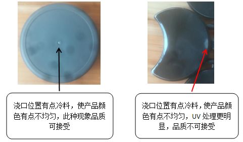不良内容:冷料斑(浇口处有扇形冷料,颜色明显分两种),不能正常生产;