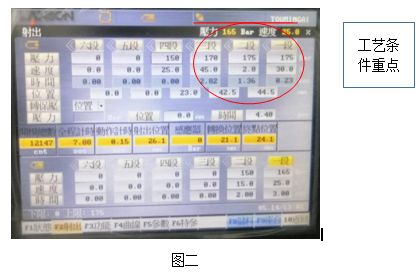 图二的工艺条件,关键之处为第二段的切换位置42.5mm,由此位置控制冷料的确切点,这样就不会过多,产品出现波浪纹,过少产品出现冷料斑;